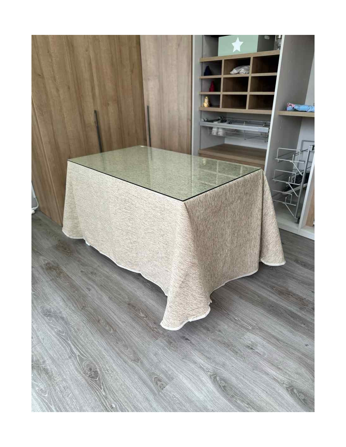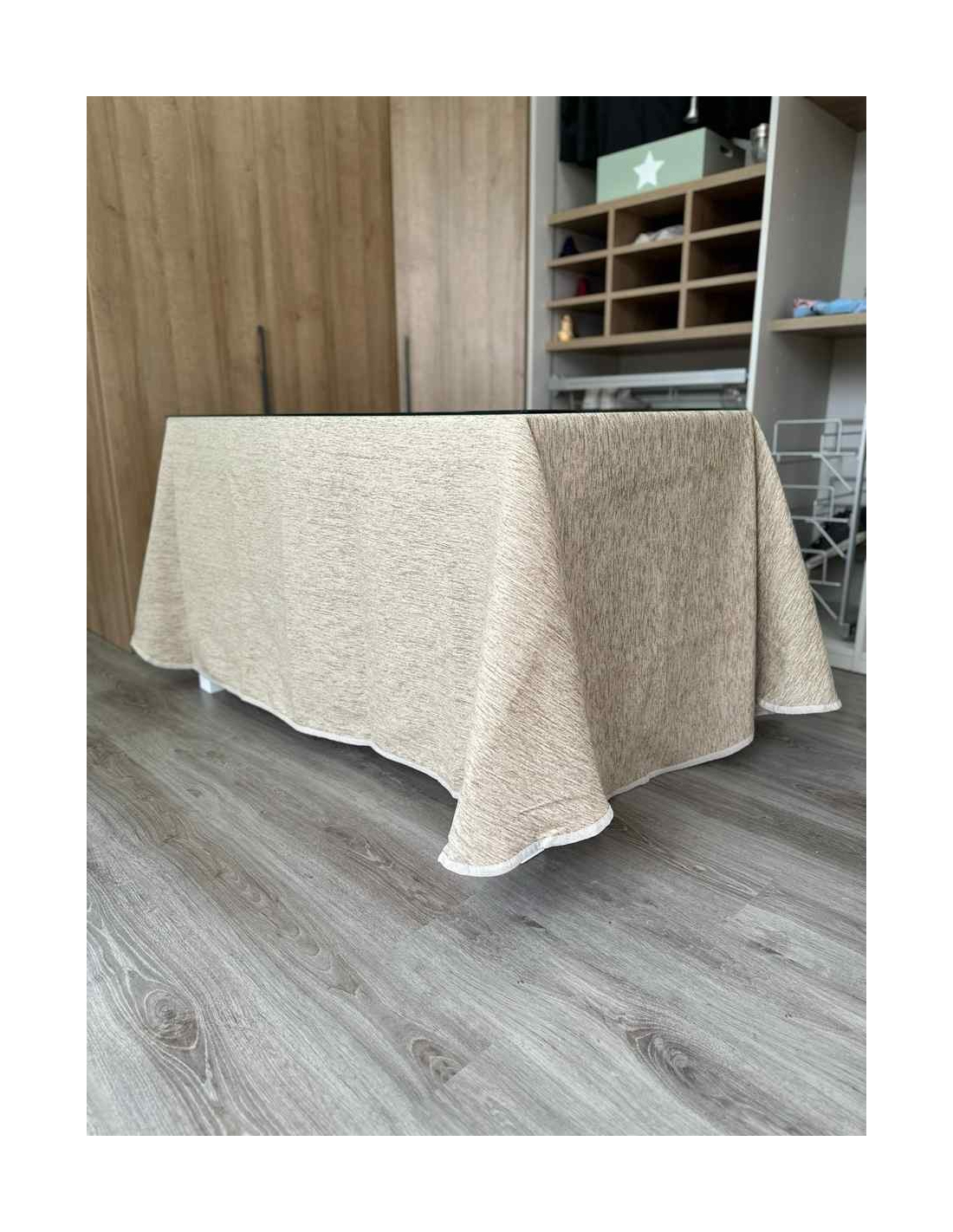 Dale un toque elegante a tu mesa camilla con nuestra falda rectangular sin pliegues en color beige
