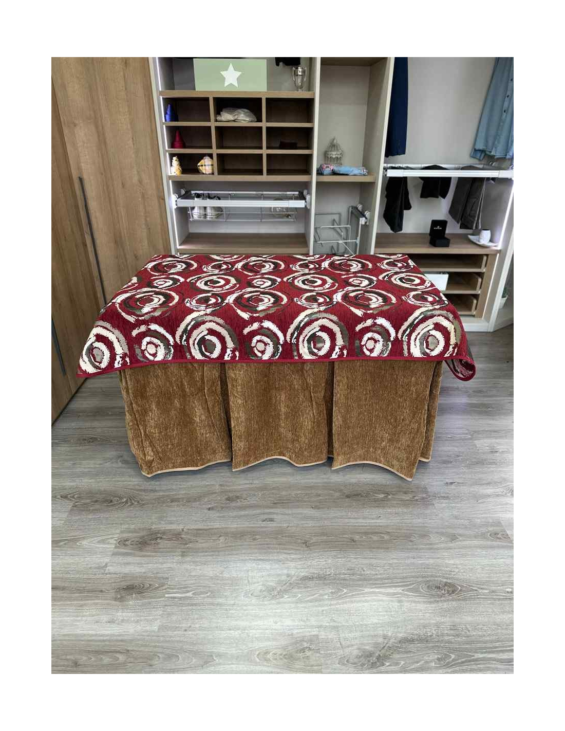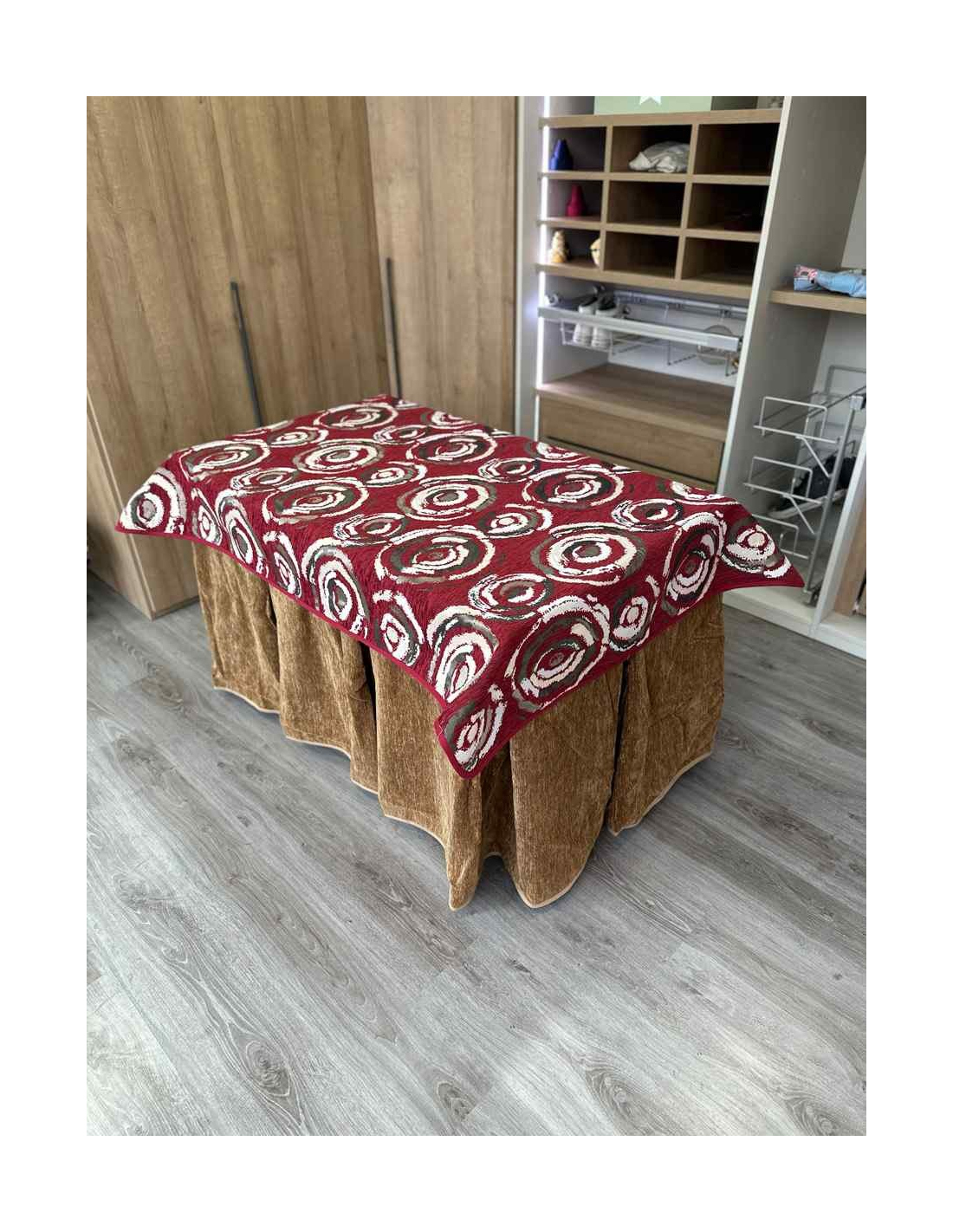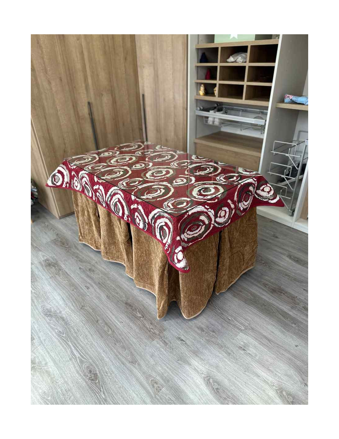 Confeccionada con 10 pliegues para mantener el calor de manera eficiente. Las tablas comunmente llamados pliegues, favorecen la retención de la temperatura impidiendo escapar el calor cuando nos sentamos en la mesa y nos cubrimos con ella. Gracias a nuestro diseño en los fuelles la falda de mesa camilla caerá cubriéndono los laterales e impidiendo que escape el calor.