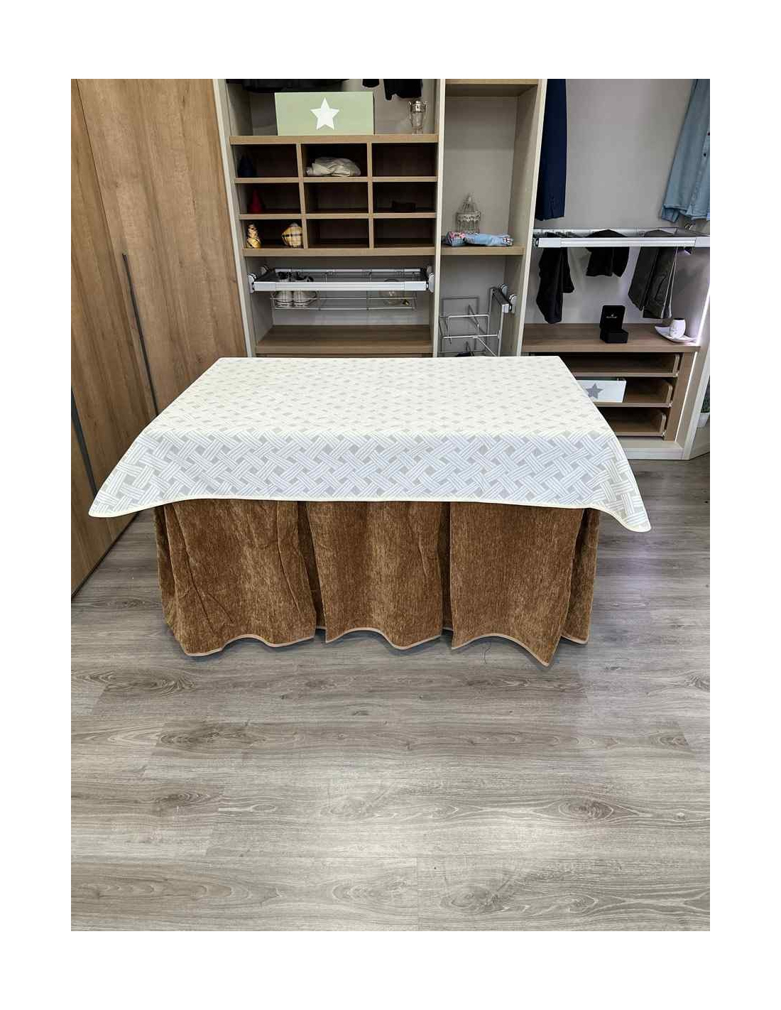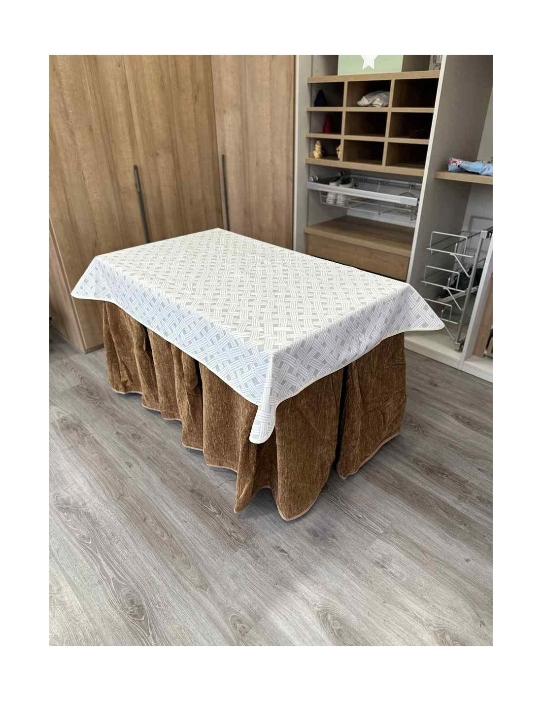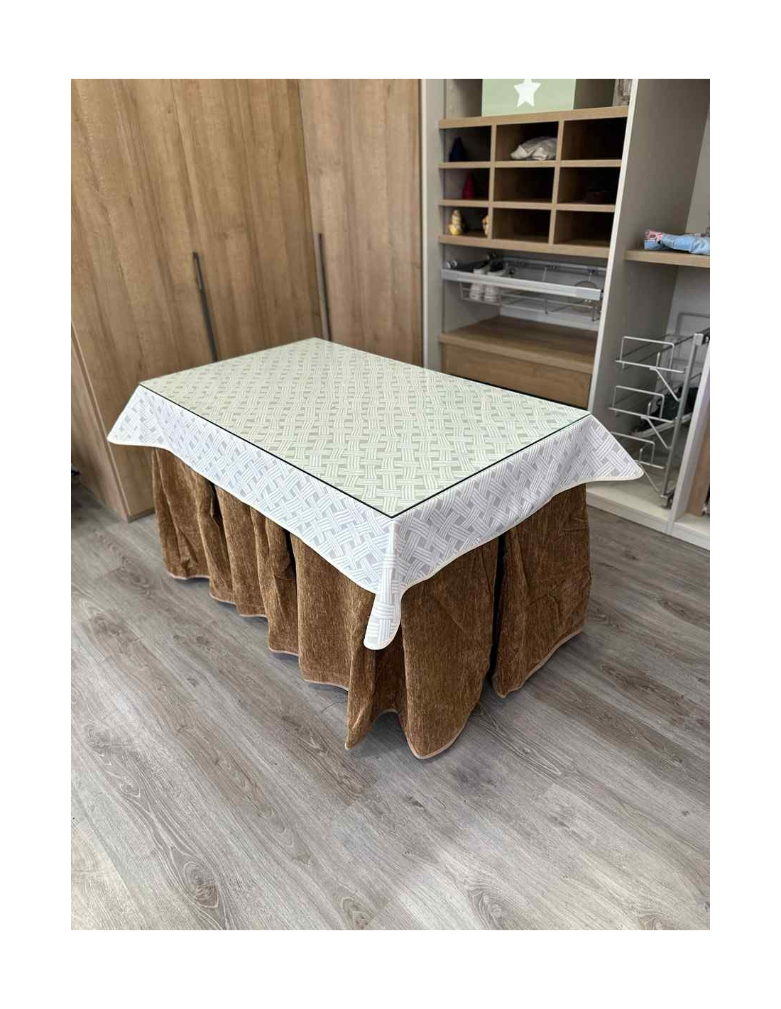 Confeccionada con 10 pliegues para mantener el calor de manera eficiente. Las tablas comunmente llamados pliegues, favorecen la retención de la temperatura impidiendo escapar el calor cuando nos sentamos en la mesa y nos cubrimos con ella. Gracias a nuestro diseño en los fuelles la falda de mesa camilla caerá cubriéndono los laterales e impidiendo que escape el calor.