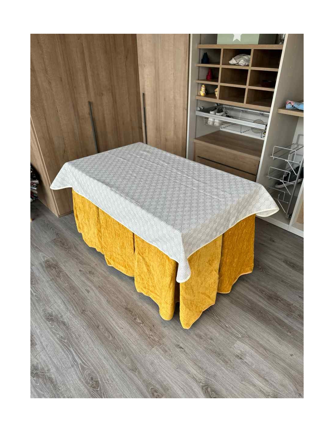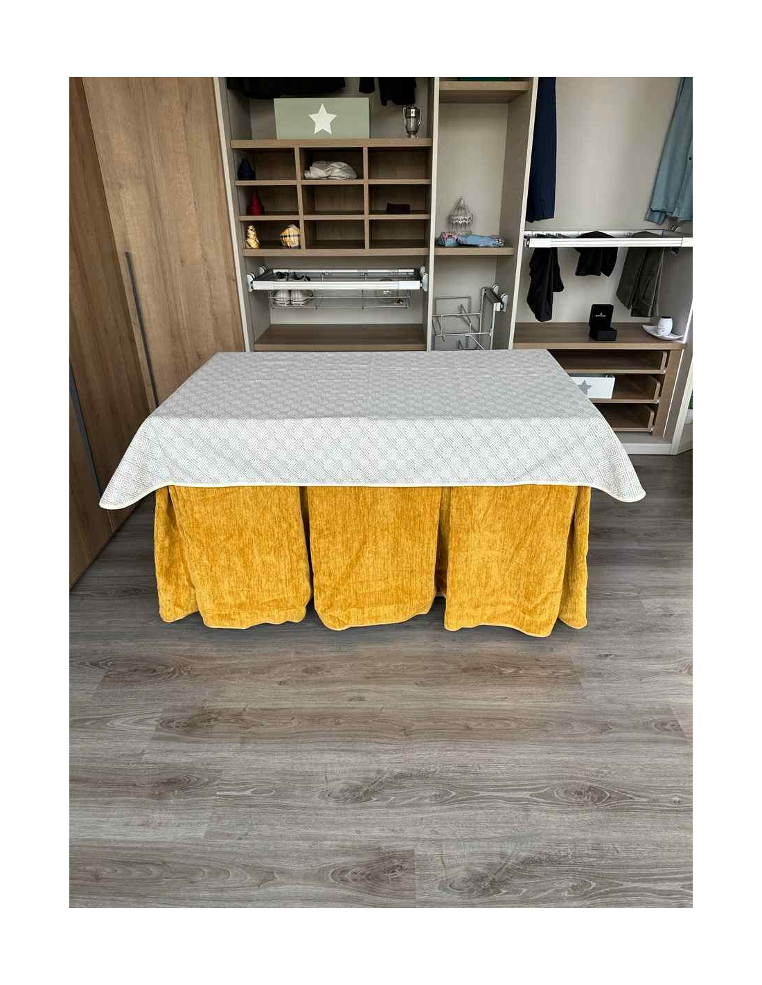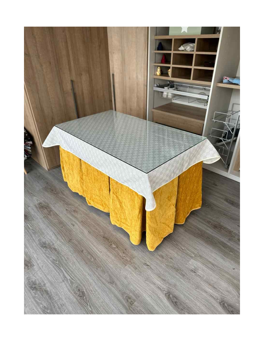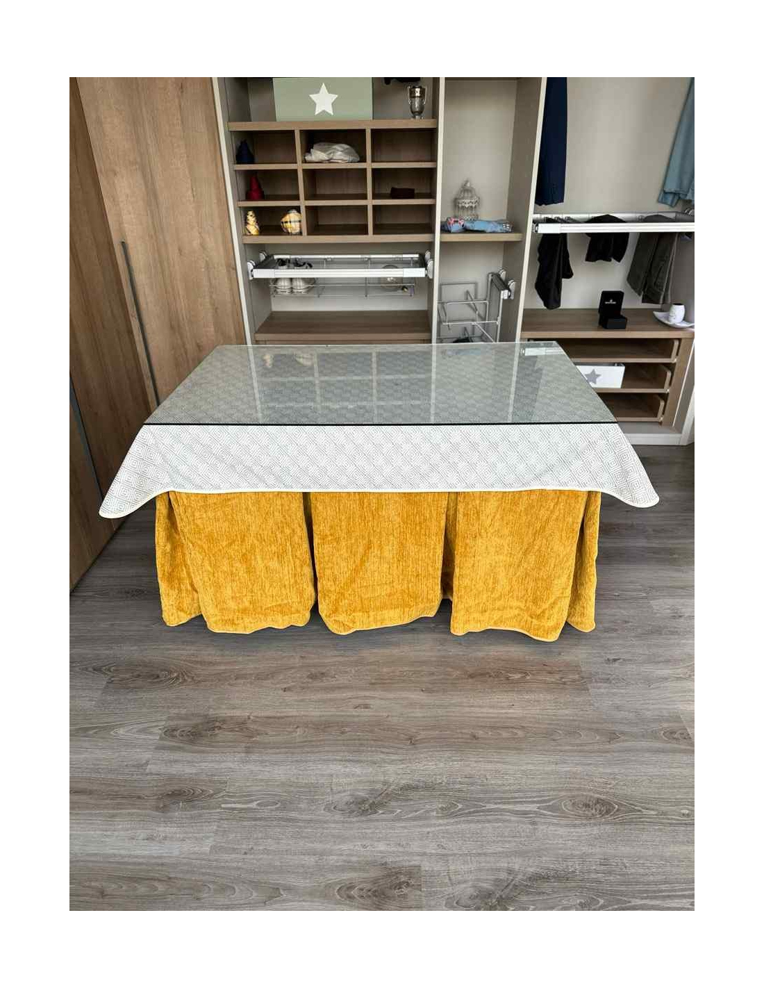 Confeccionada con 10 pliegues para mantener el calor de manera eficiente. Las tablas comunmente llamados pliegues, favorecen la retención de la temperatura impidiendo escapar el calor cuando nos sentamos en la mesa y nos cubrimos con ella. Gracias a nuestro diseño en los fuelles la falda de mesa camilla caerá cubriéndono los laterales e impidiendo que escape el calor.