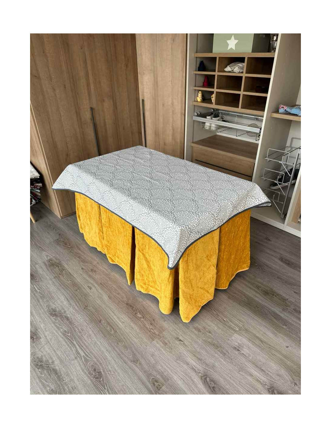 Confeccionada con 10 pliegues para mantener el calor de manera eficiente. Las tablas comunmente llamados pliegues, favorecen la retención de la temperatura impidiendo escapar el calor cuando nos sentamos en la mesa y nos cubrimos con ella. Gracias a nuestro diseño en los fuelles la falda de mesa camilla caerá cubriéndono los laterales e impidiendo que escape el calor.