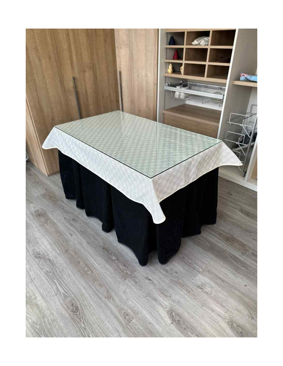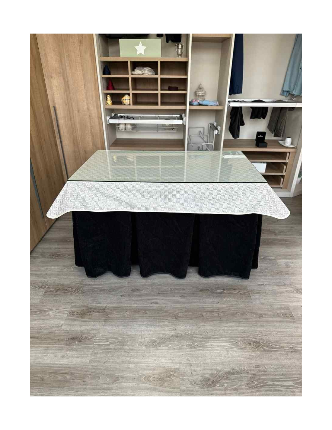 Confeccionada con 10 pliegues para mantener el calor de manera eficiente. Las tablas comunmente llamados pliegues, favorecen la retención de la temperatura impidiendo escapar el calor cuando nos sentamos en la mesa y nos cubrimos con ella. Gracias a nuestro diseño en los fuelles la falda de mesa camilla caerá cubriéndono los laterales e impidiendo que escape el calor.