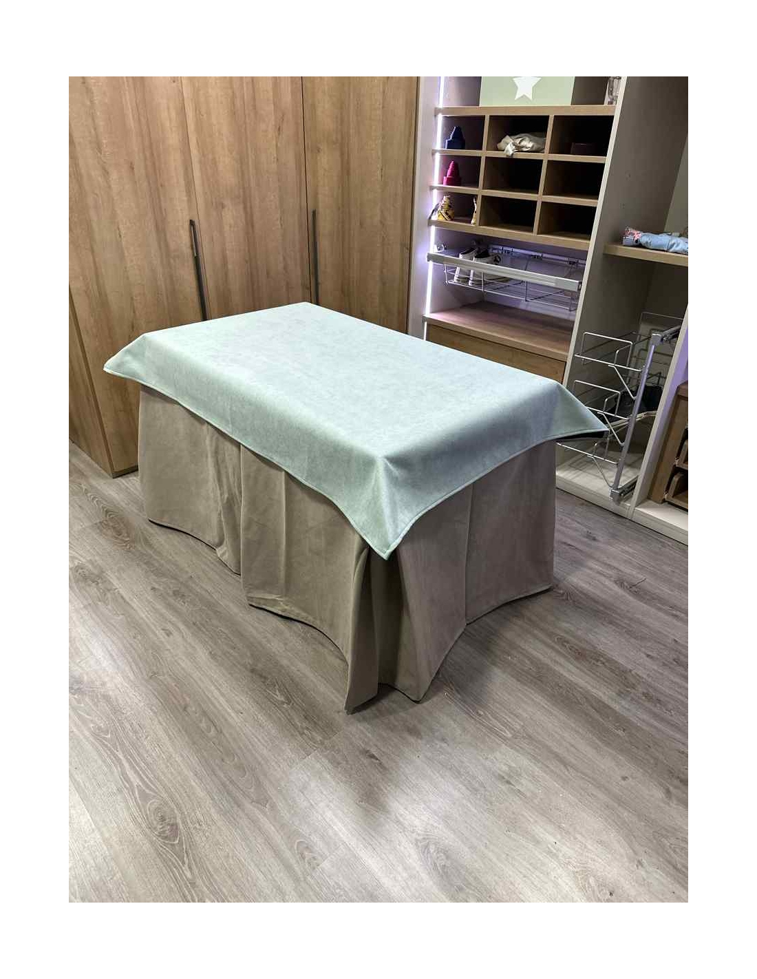 Conjunto Completo Antimanchas Aterciopelada Triplegrueso color Beige con Tapete Liso Verde Pastel