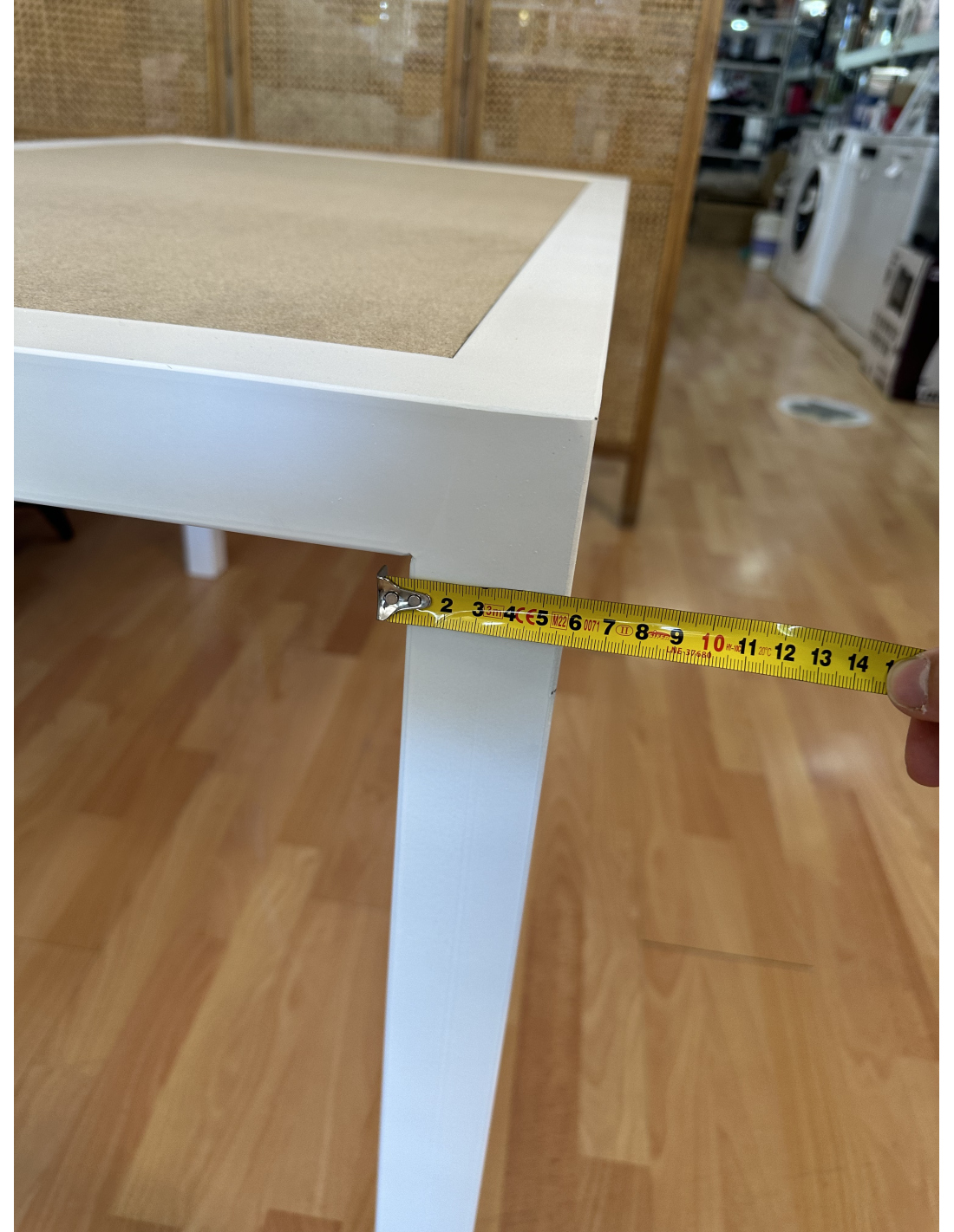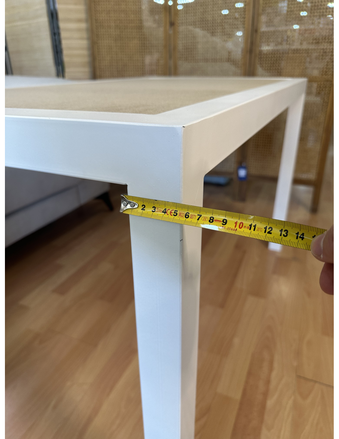 Mesa camilla de forja color blanca. Tamaños disponibles: 120x70 cm, 130x80 cm y 140x80 cm, todas con una altura de 73 cm.