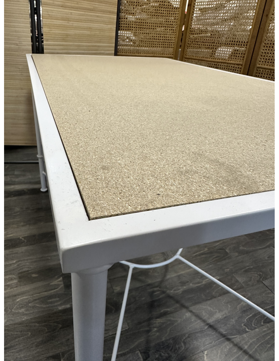 Mesa camilla de forja color blanco. Tamaños disponibles: 120x70 cm, 130x80 cm y 140x80 cm, todas con una altura de 73 cm.