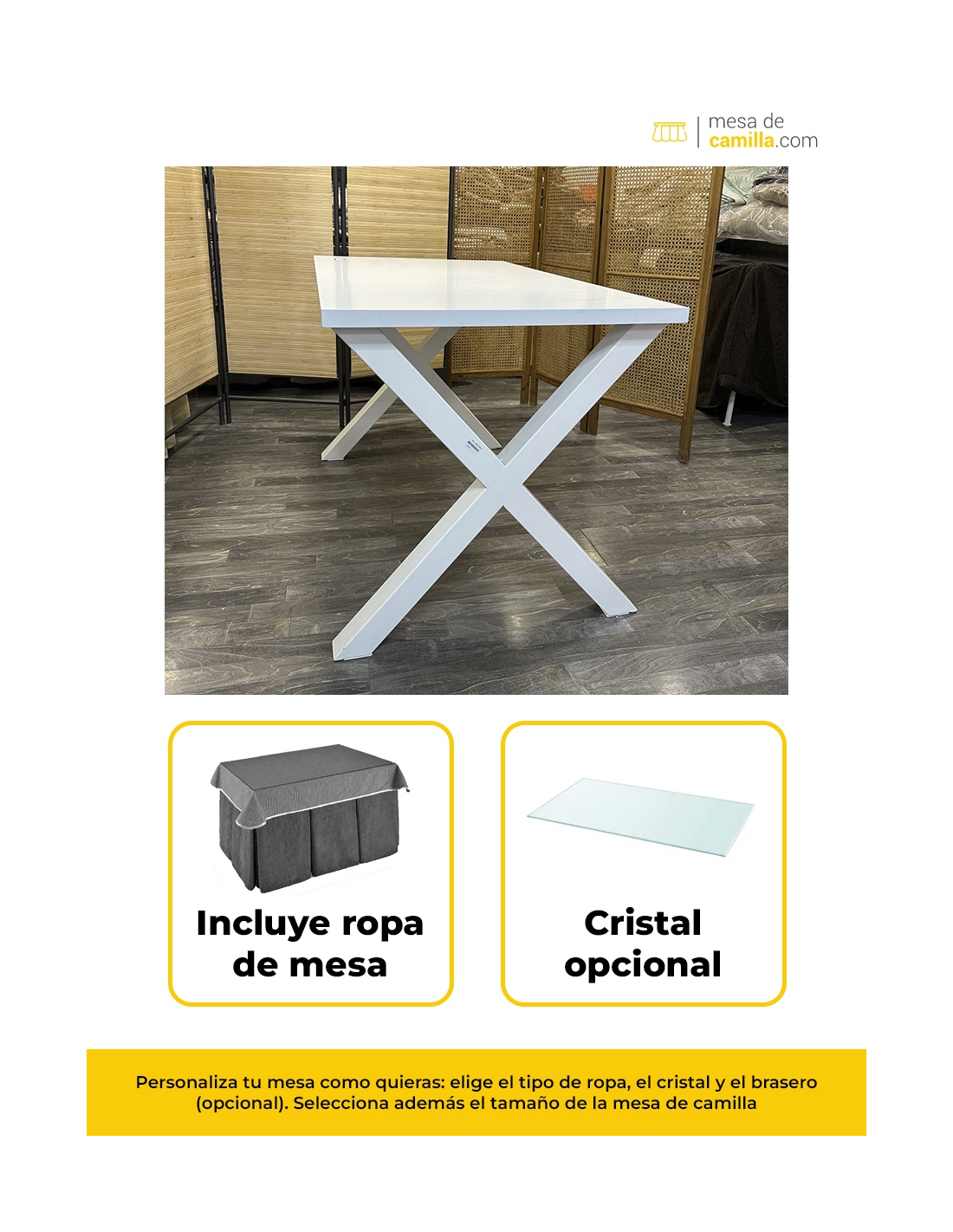 Mesa camilla de forja en forma de X color blanco. Tamaños disponibles: 120x70 cm, 130x80 cm y 140x80 cm, todas con una altura de 73 cm.