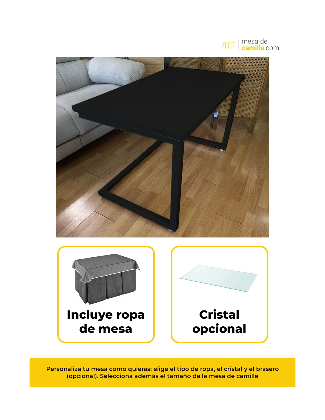 Mesa camilla de forja color negra. Tamaños disponibles: 120x70 cm, 130x80 cm y 140x80 cm, todas con una altura de 73 cm.