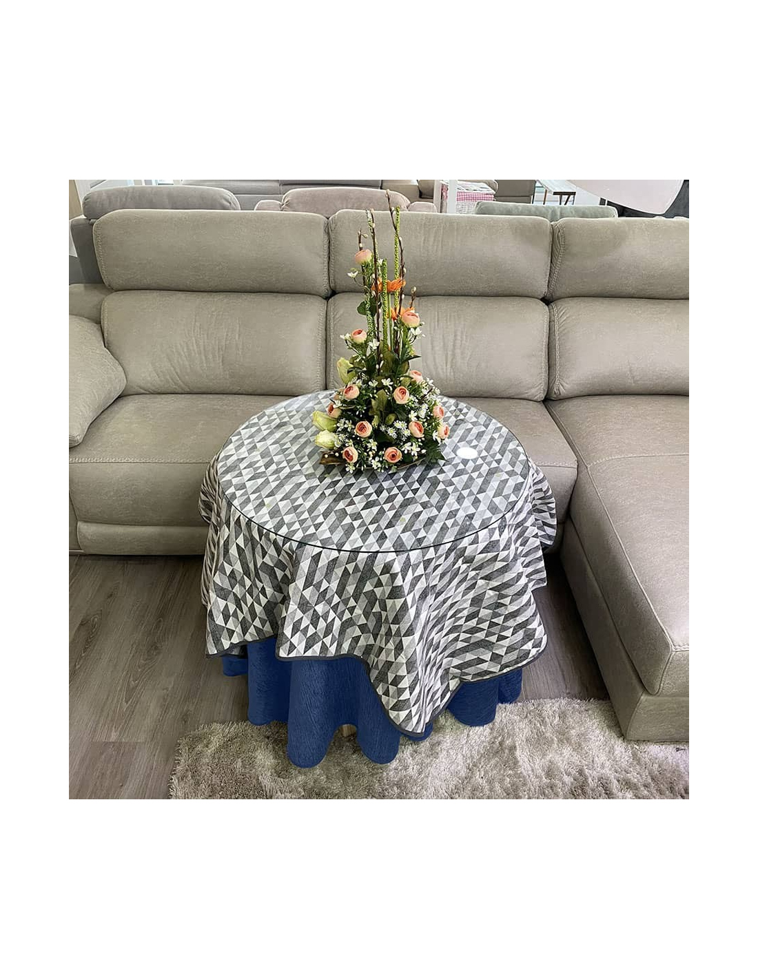 Conjunto de Mesa Redonda en medidas a elegir con Ropa Chenilla de costura reforzada en color Azul con tapete Picasso y Cristal opcional.