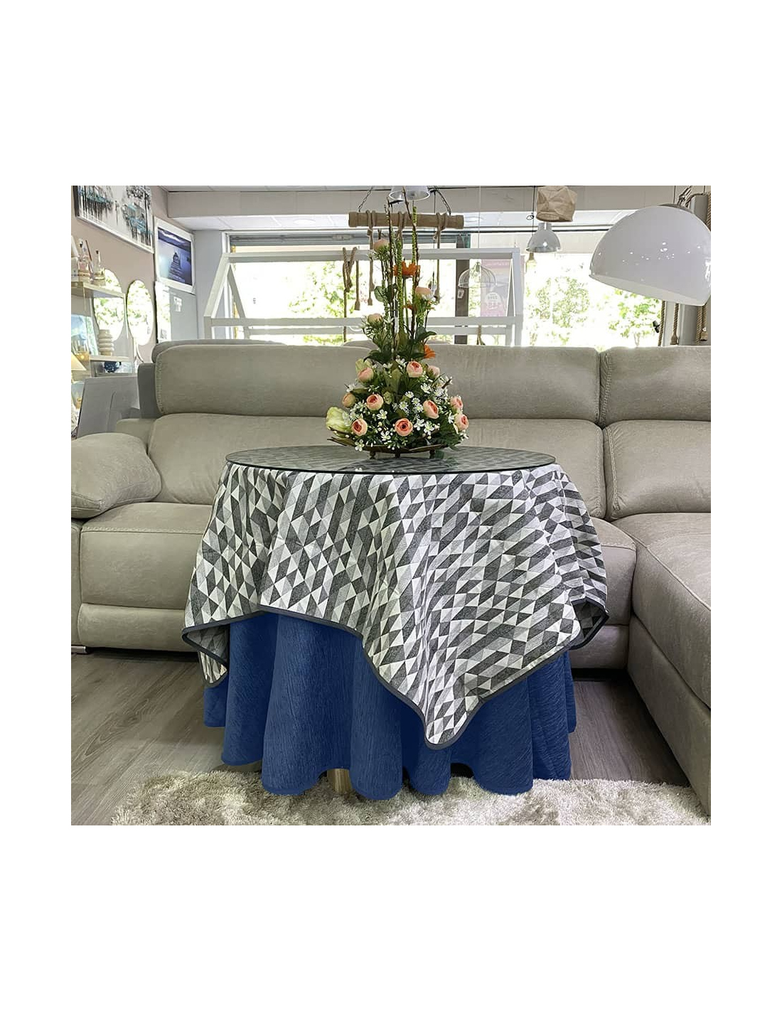 Conjunto Mesa Redonda + Ropa Chenilla Costura Reforzada color Azul con Tapete Picasso Multimedida