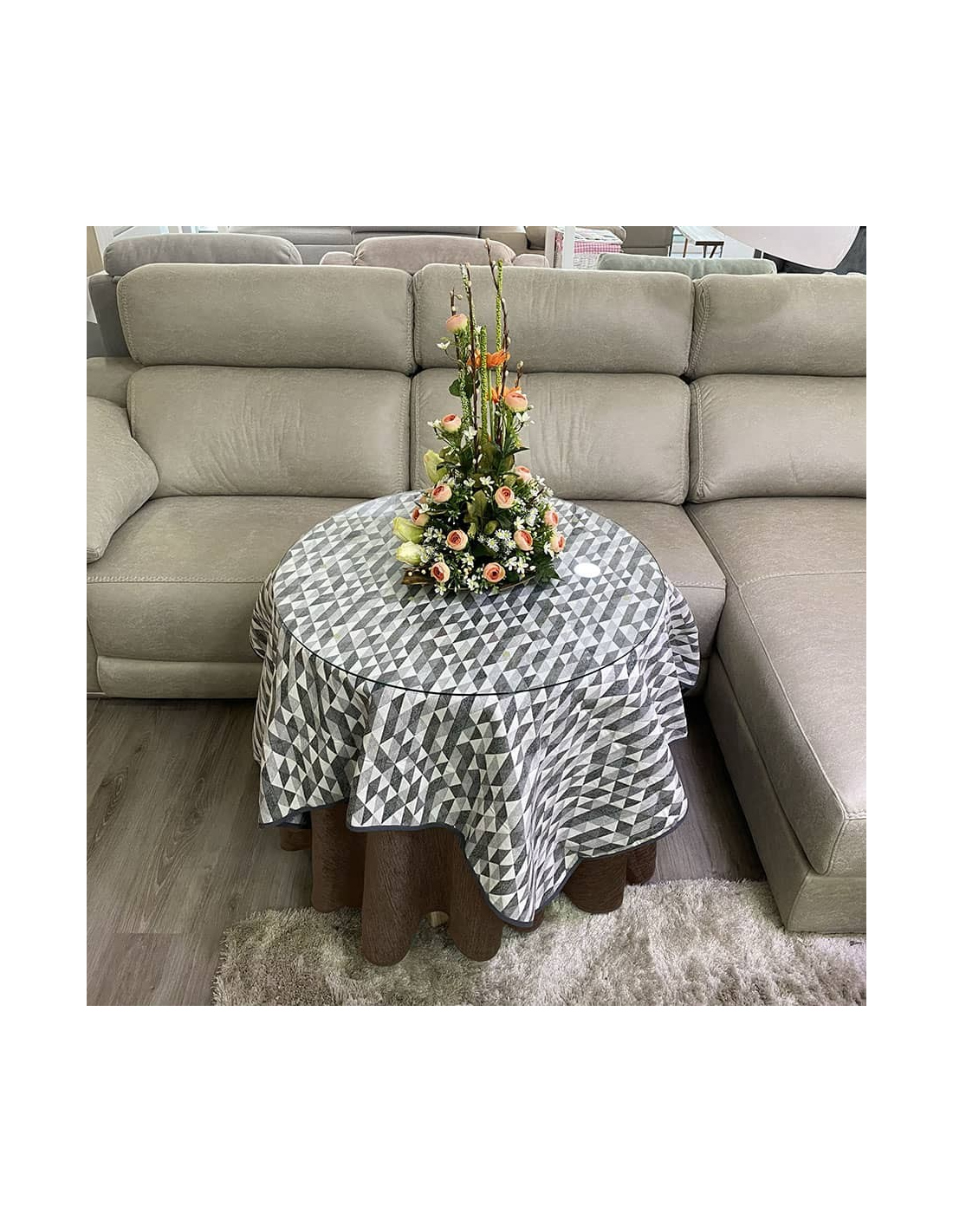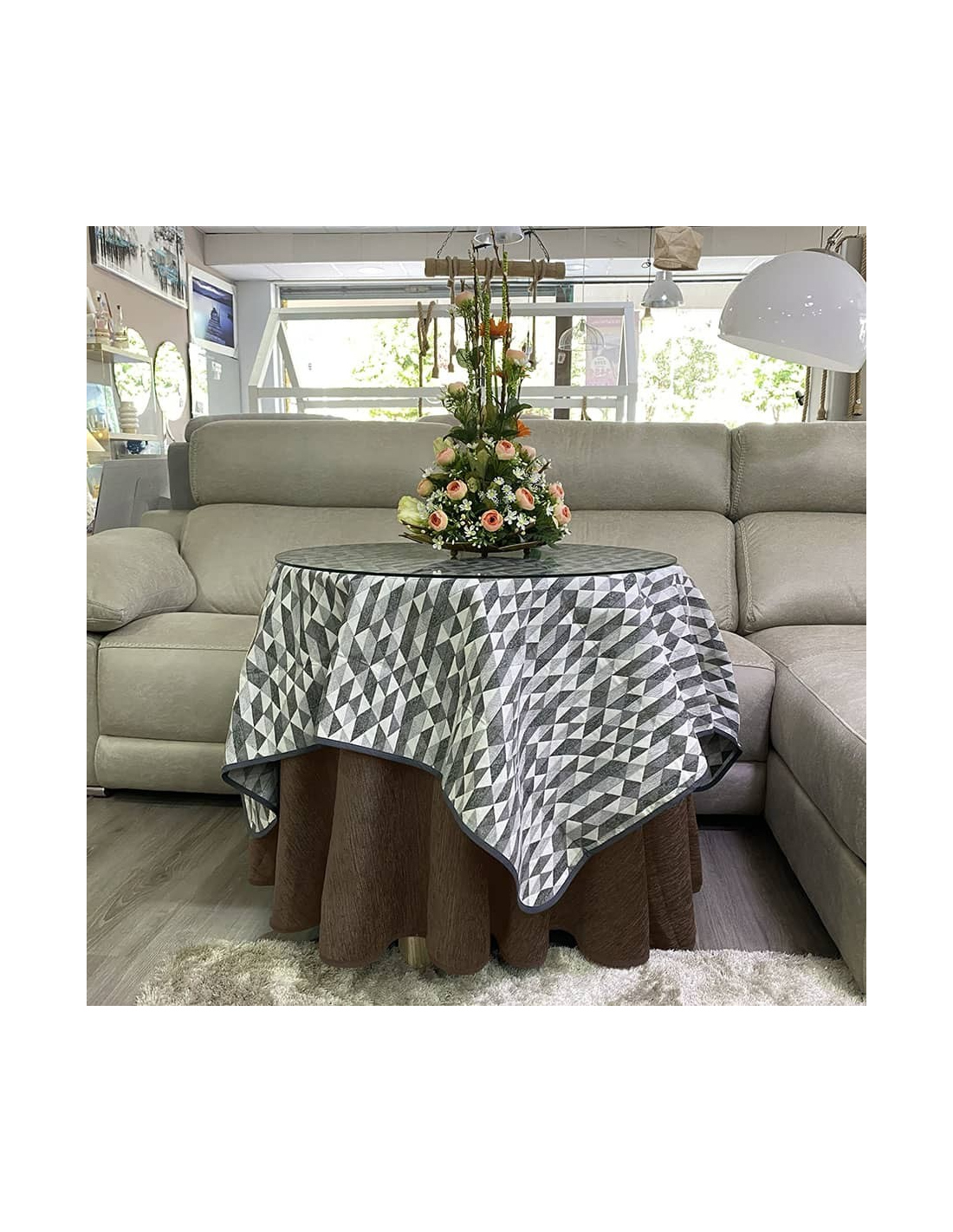 Conjunto de Mesa Redonda en medidas a elegir con Ropa Chenilla de costura reforzada en color Chocolate con tapete Picasso y Cristal opcional.