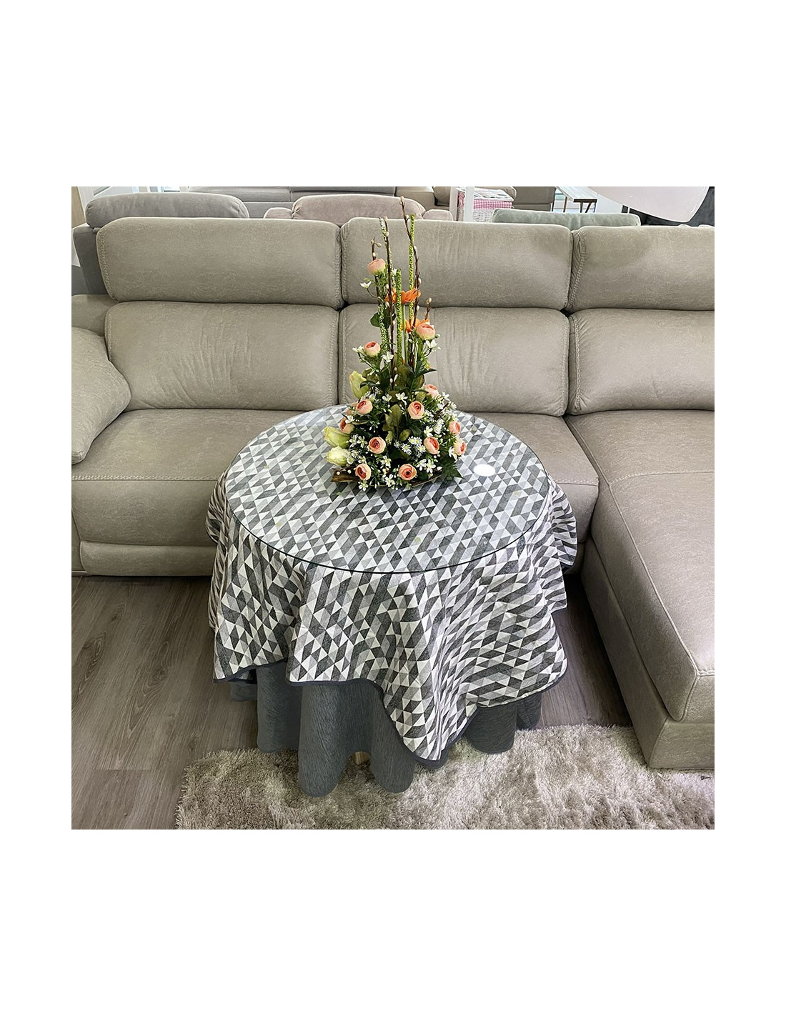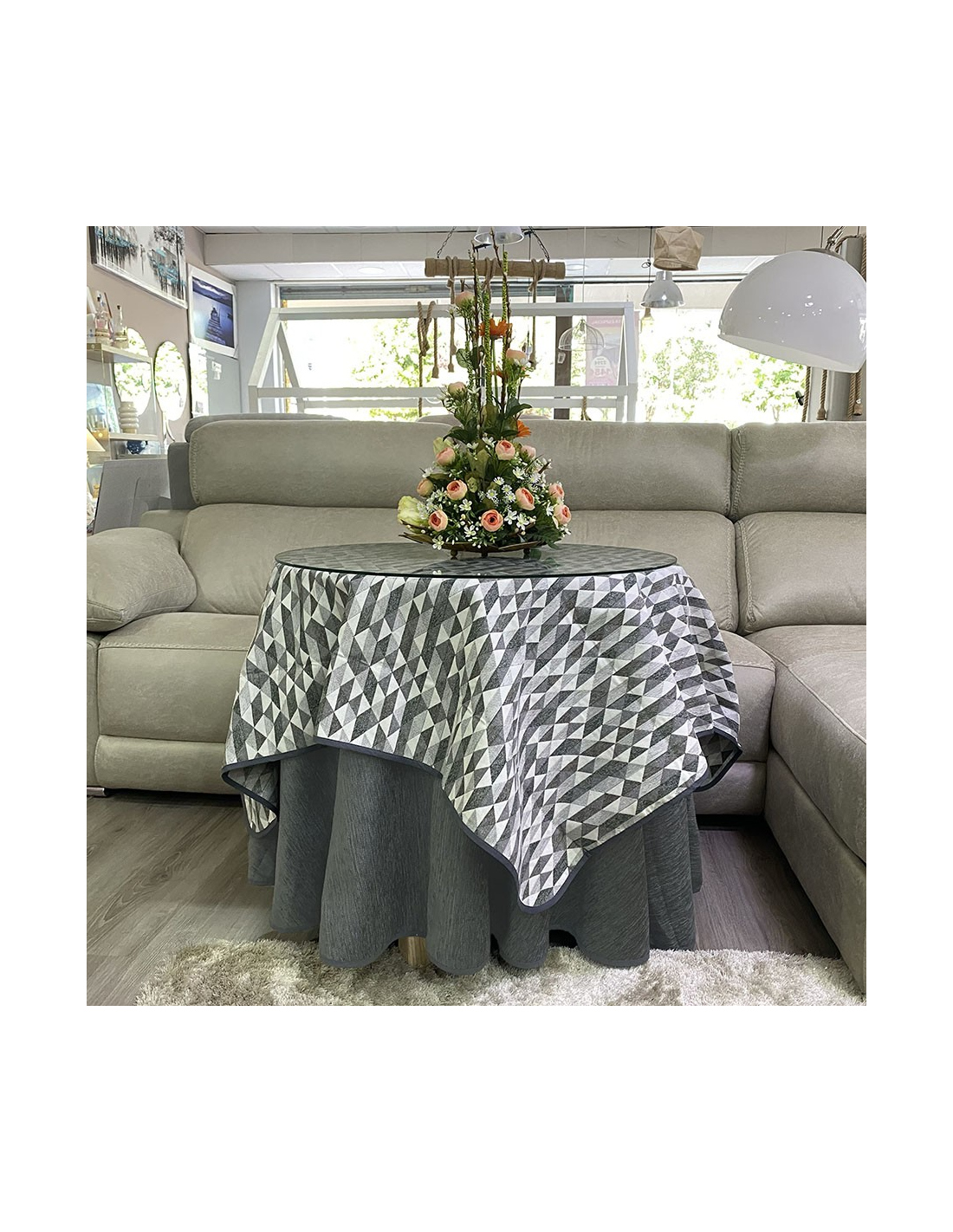Conjunto de Mesa Redonda en medidas a elegir con Ropa Chenilla de costura reforzada en color Grafito con tapete Picasso y Cristal opcional.