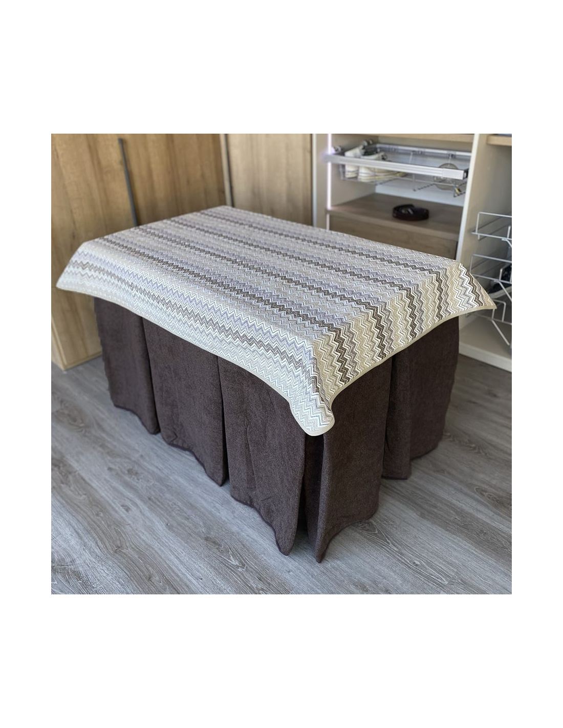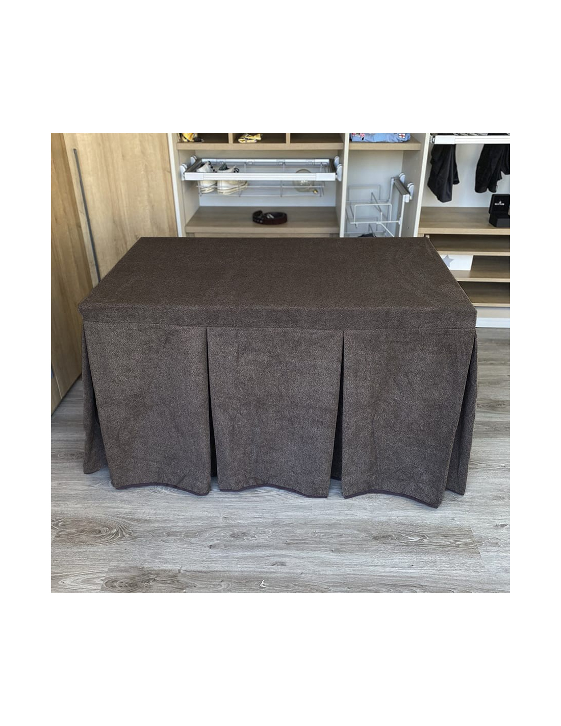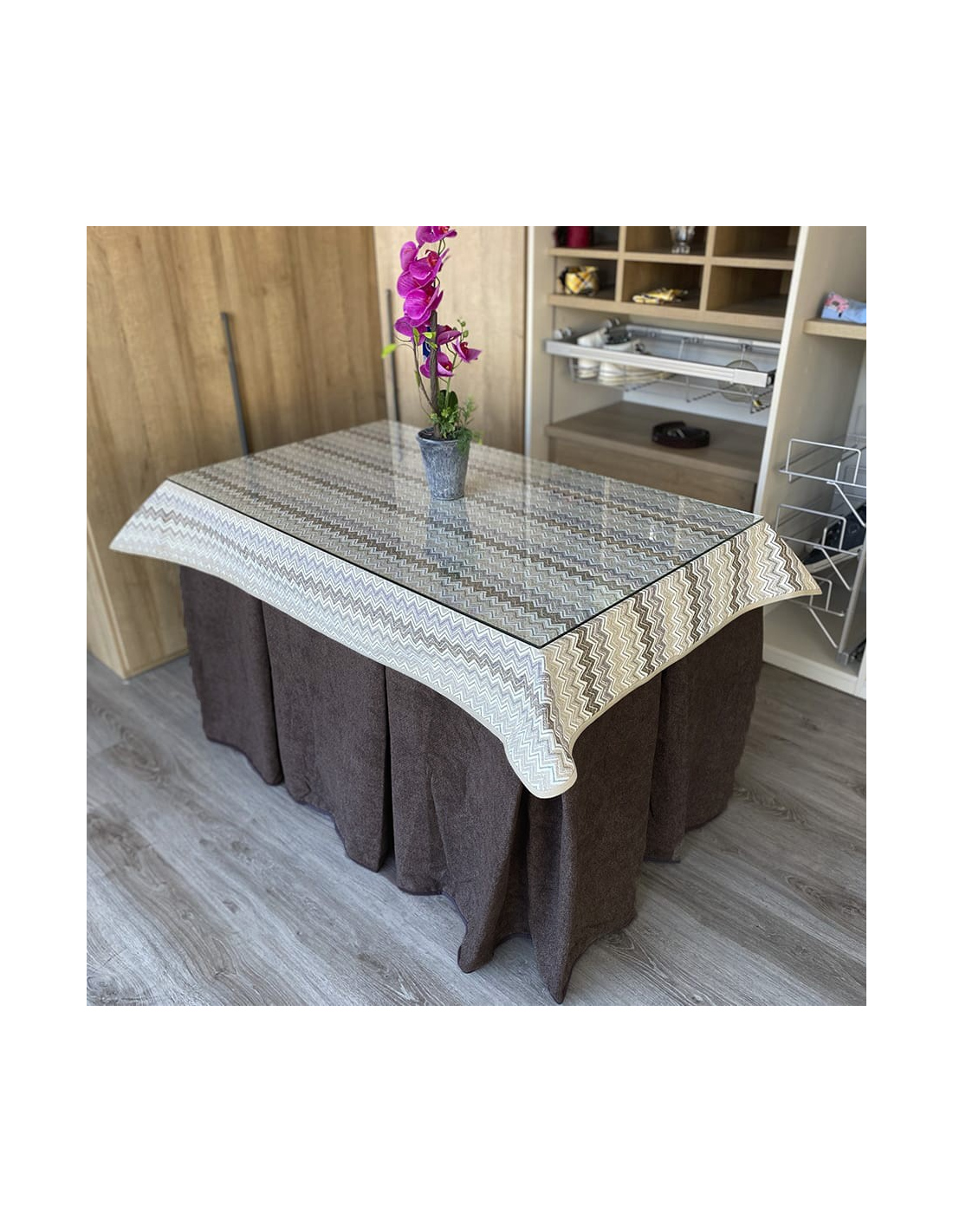 Pack hecho a medida con mesa camilla a elegir y ropa de mesa camilla con tejido extra grueso color chocolate con tapete elaborada con tecnología Teflón y HOT-TERMIC de gran capacidad calórica y repelente a los líquidos. Cristal opcional de 4mm y 6mm.