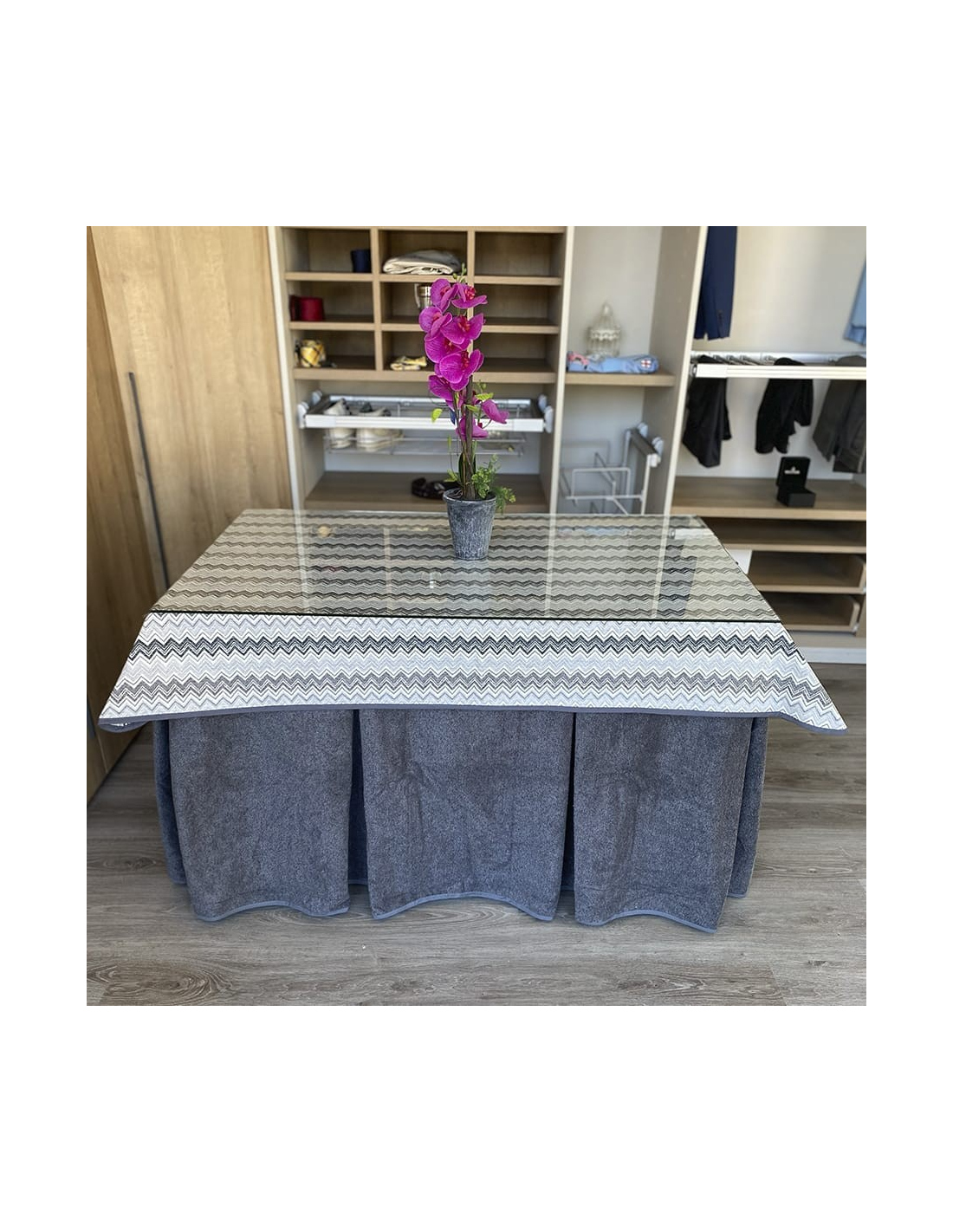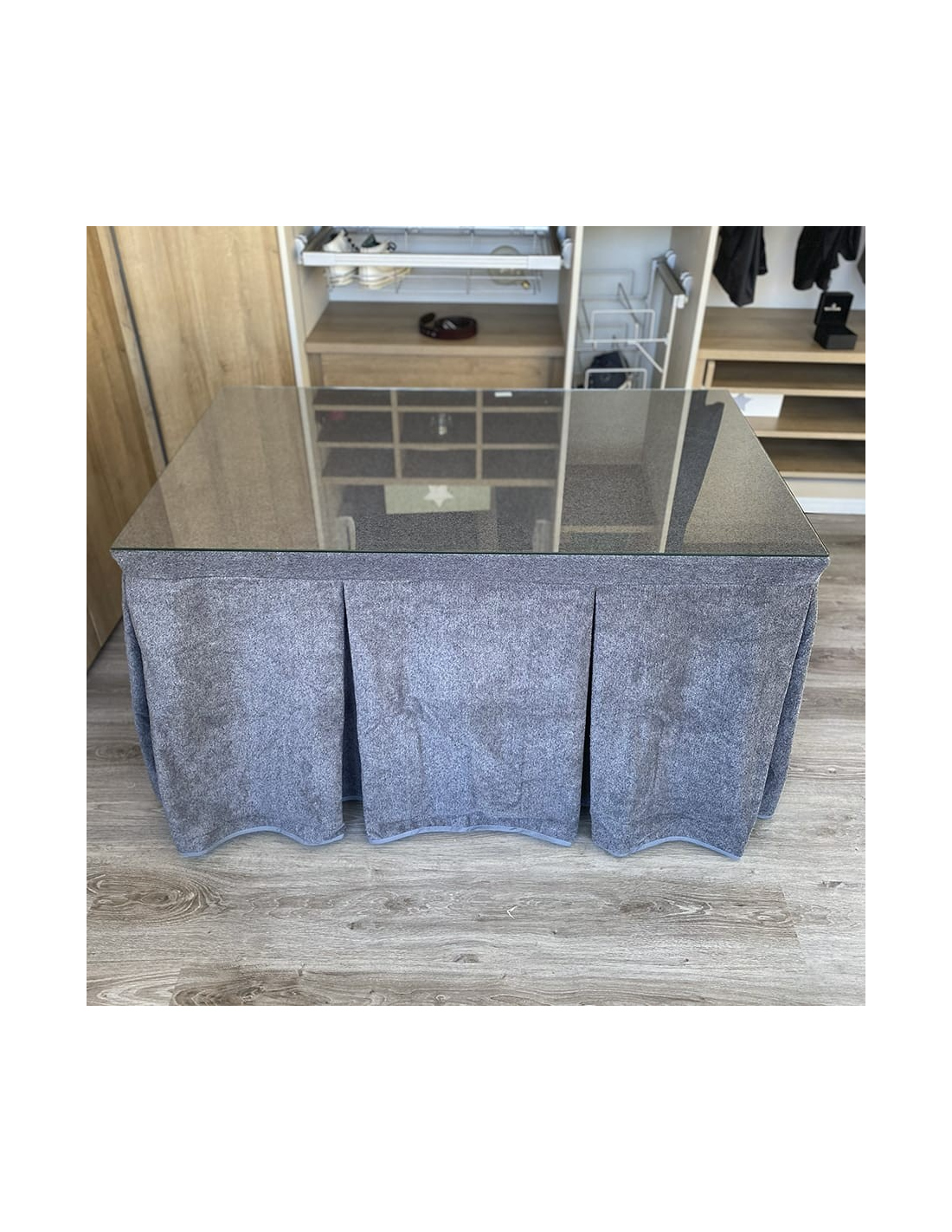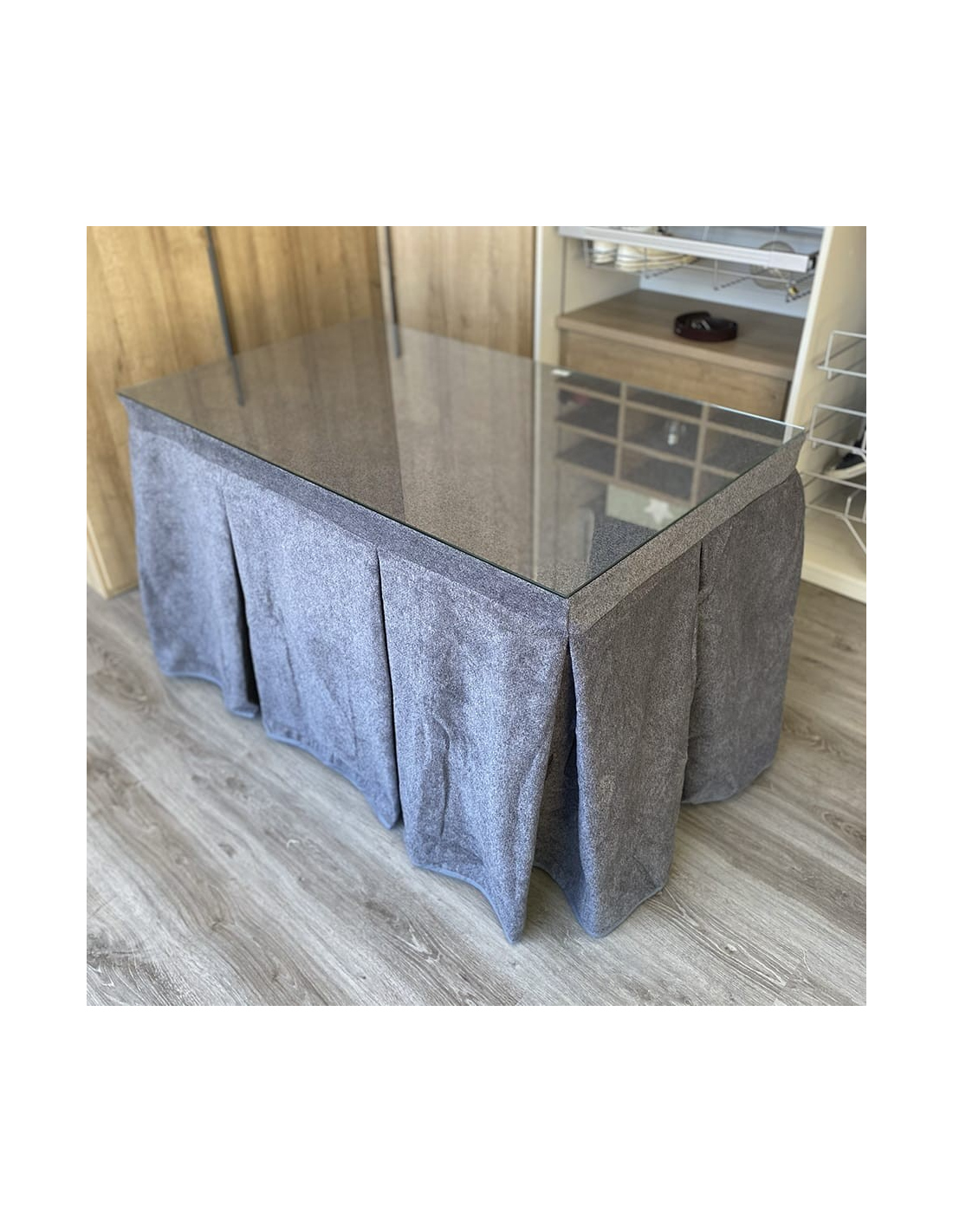 Pack con mesa camilla a elegir y ropa de mesa camilla con tejido extra grueso color grafito elaborada con tecnología Teflón y HOT-TERMIC de gran capacidad calórica y repelente a los líquidos. Cristal opcional de 4mm y 6mm.