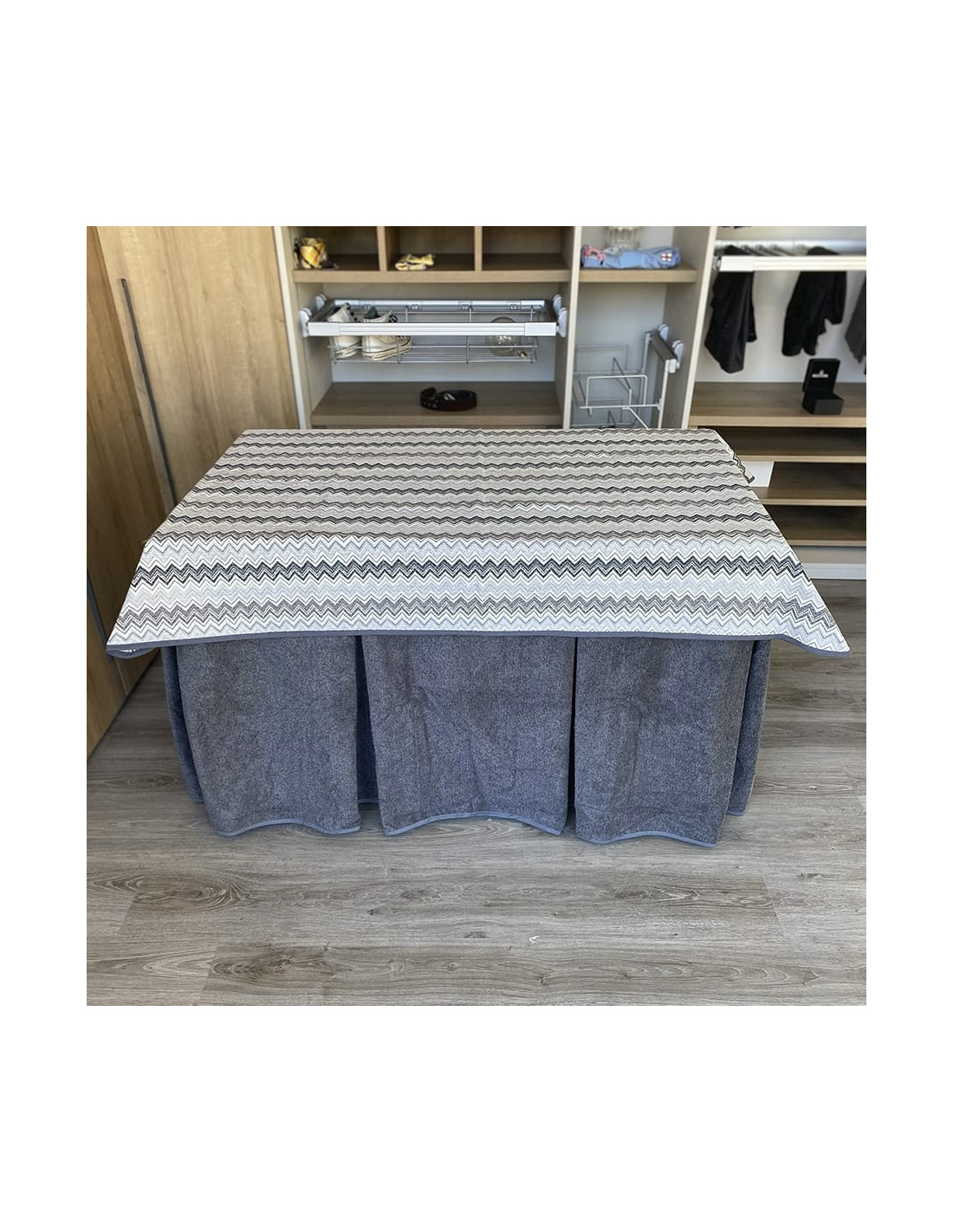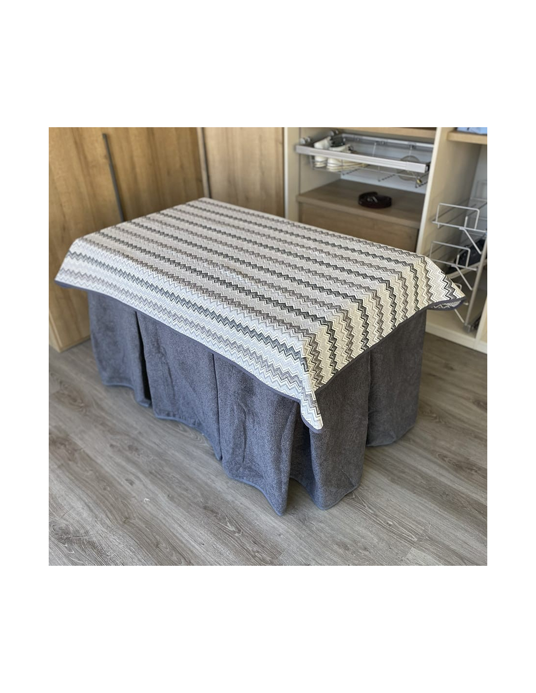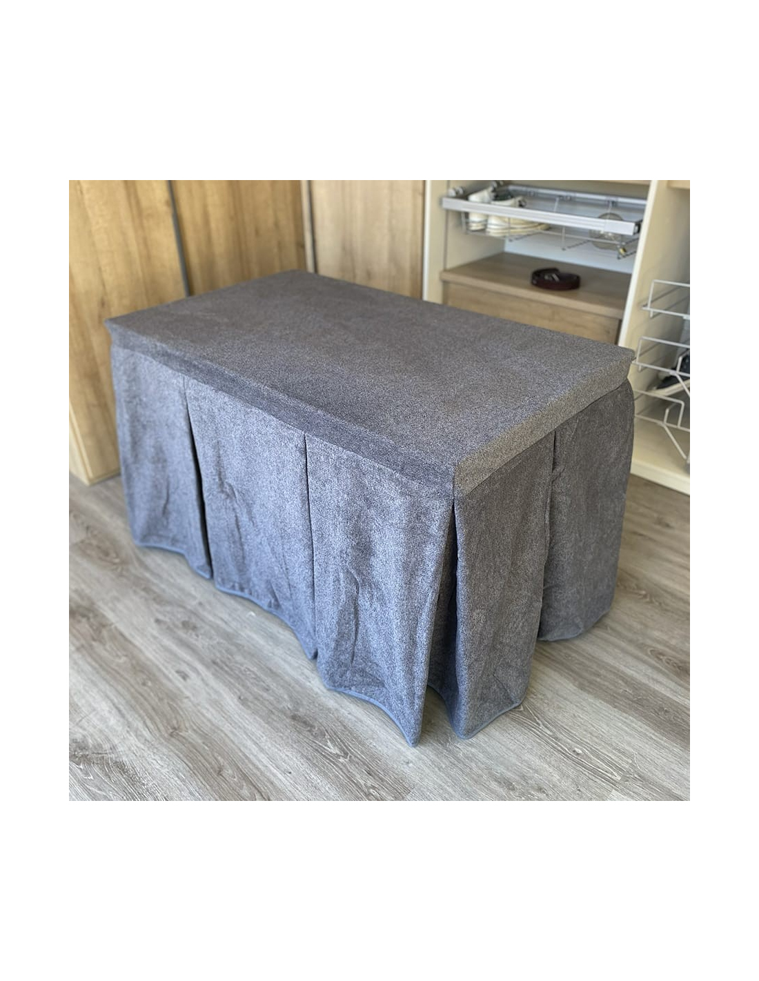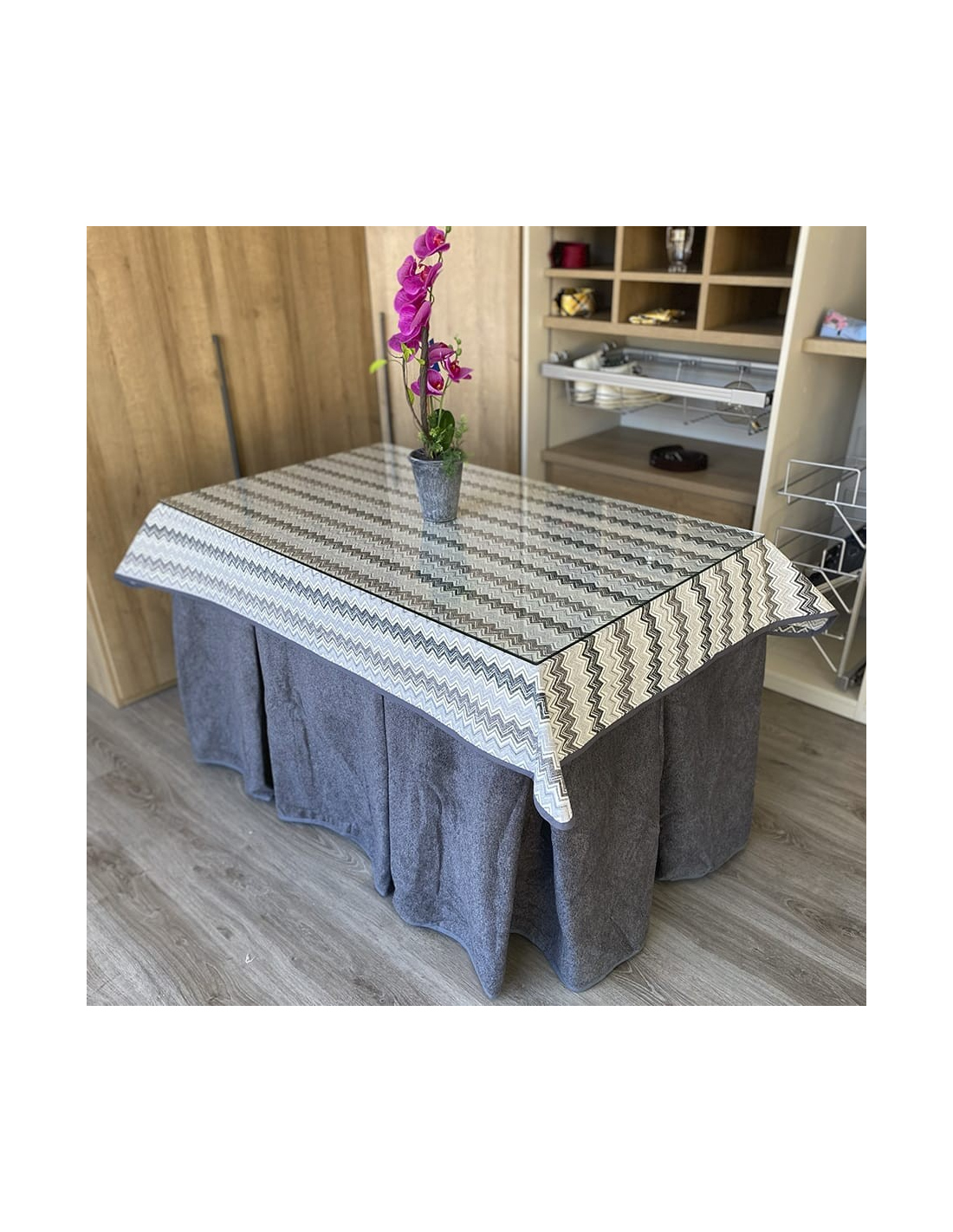 Pack con mesa camilla a elegir y ropa de mesa camilla con tejido extra grueso color grafito elaborada con tecnología Teflón y HOT-TERMIC de gran capacidad calórica y repelente a los líquidos. Cristal opcional de 4mm y 6mm.