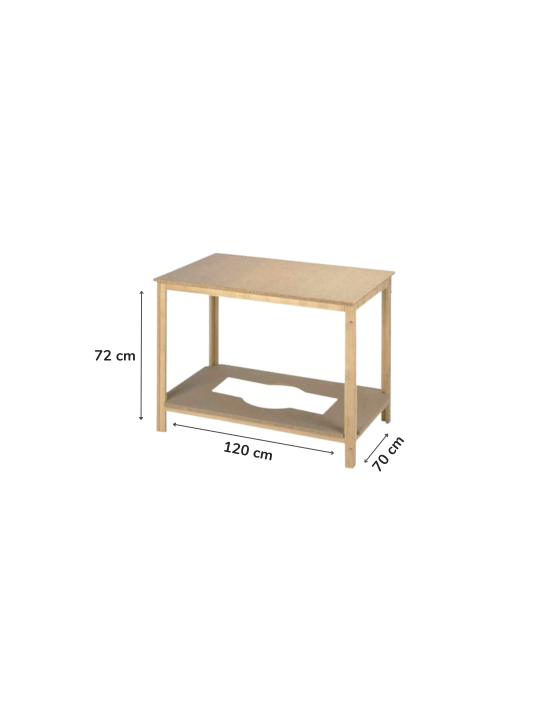 - Estable y resistente gracias a sus patas de madera de pino de 4x4cm de grosor, con tablero y tarima en DM.