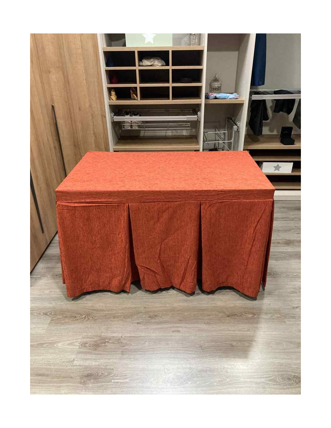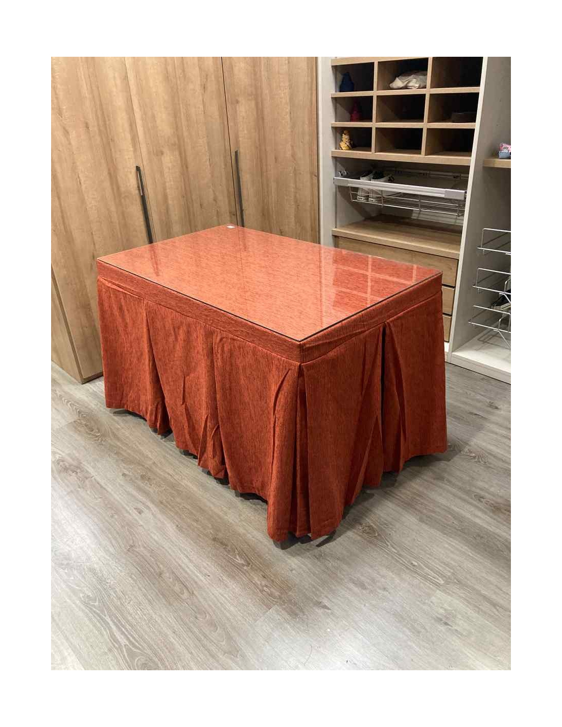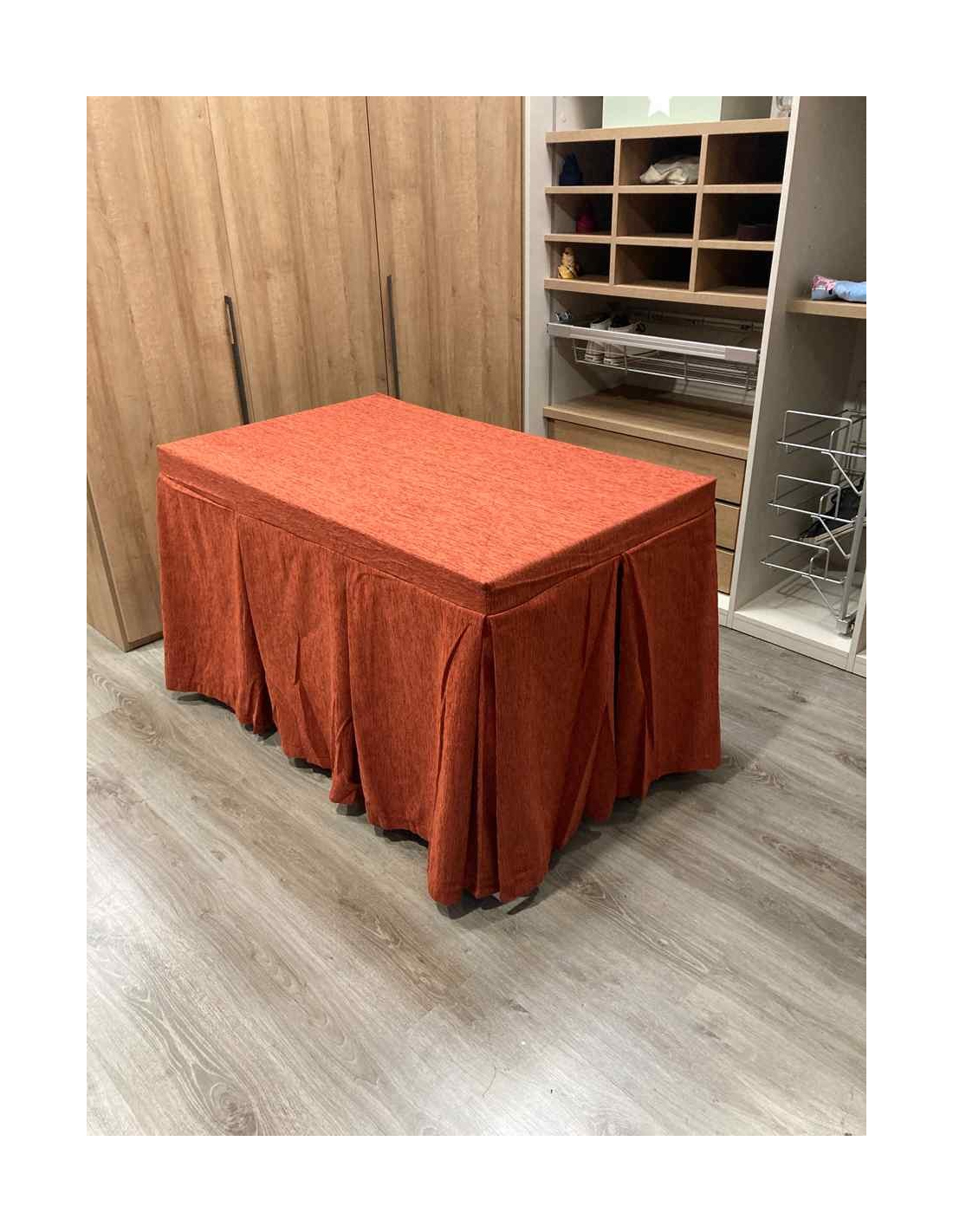 Confeccionada con 8-10 pliegues para mantener el calor de manera eficiente. Las tablas comunmente llamados pliegues, favorecen la retención de la temperatura impidiendo escapar el calor cuando nos sentamos en la mesa y nos cubrimos con ella. Gracias a nuestro diseño en los fuelles la falda de mesa camilla caerá cubriéndono los laterales e impidiendo que escape el calor.