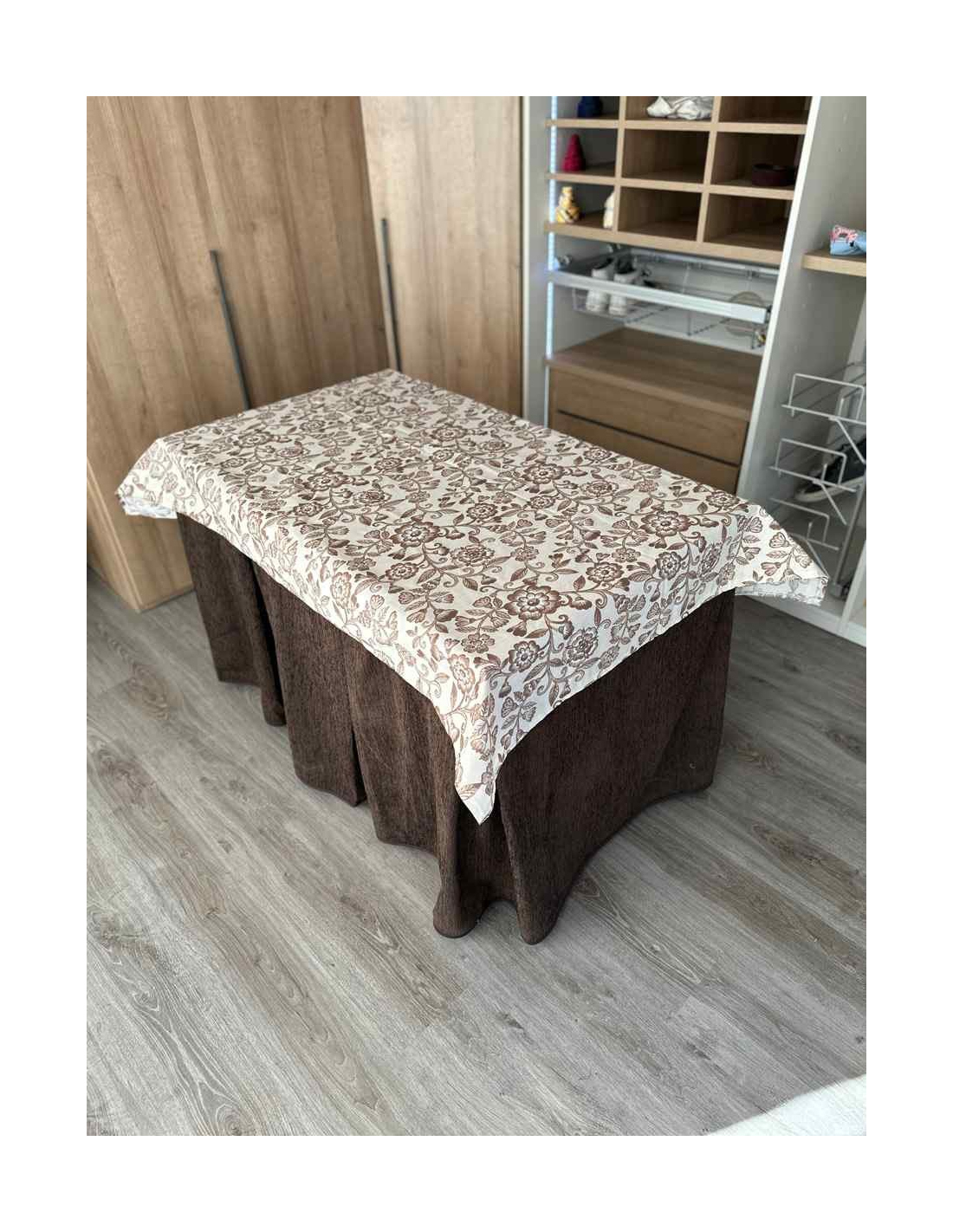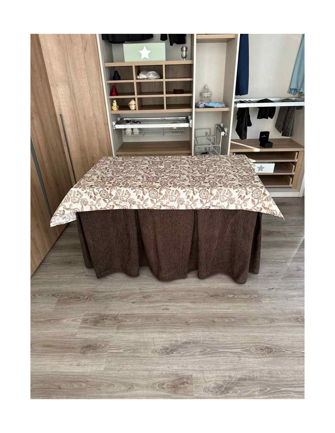Confeccionada con 8-10 pliegues para mantener el calor de manera eficiente. Las tablas comunmente llamados pliegues, favorecen la retención de la temperatura impidiendo escapar el calor cuando nos sentamos en la mesa y nos cubrimos con ella. Gracias a nuestro diseño en los fuelles la falda de mesa camilla caerá cubriéndono los laterales e impidiendo que escape el calor.