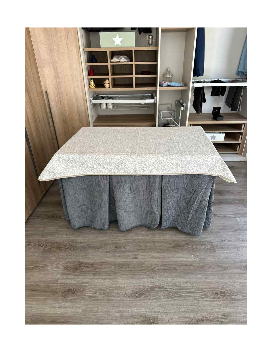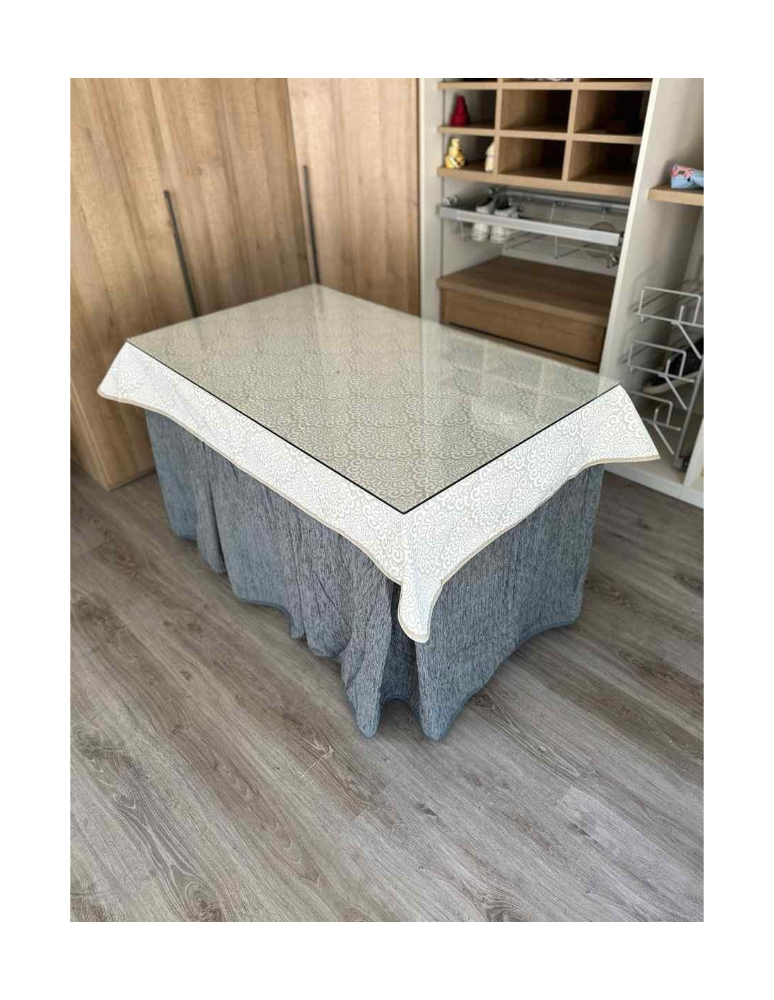 Confeccionada con 8-10 pliegues para mantener el calor de manera eficiente. Las tablas comunmente llamados pliegues, favorecen la retención de la temperatura impidiendo escapar el calor cuando nos sentamos en la mesa y nos cubrimos con ella. Gracias a nuestro diseño en los fuelles la falda de mesa camilla caerá cubriéndono los laterales e impidiendo que escape el calor.