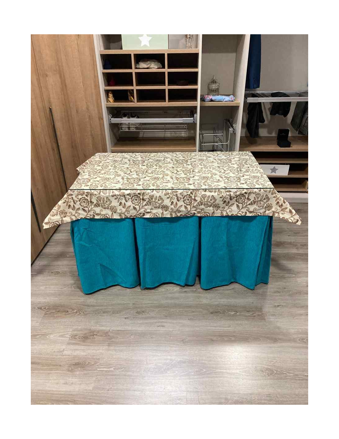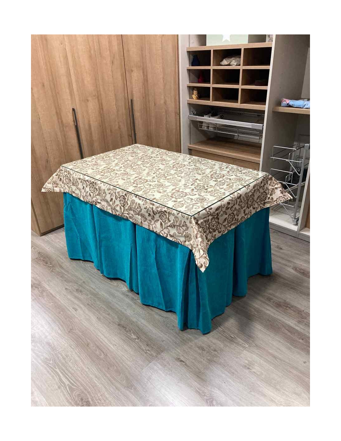 Ropa de Mesa Camilla Chenilla 8-10 Pliegues color Azul con Tapete Plantas