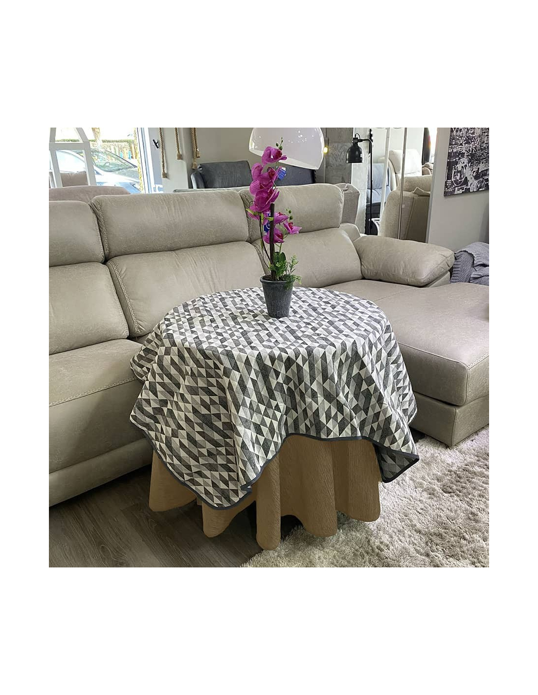 Ropa Mesa Redonda Chenilla Costura Reforzada color Beige con Tapete Picasso