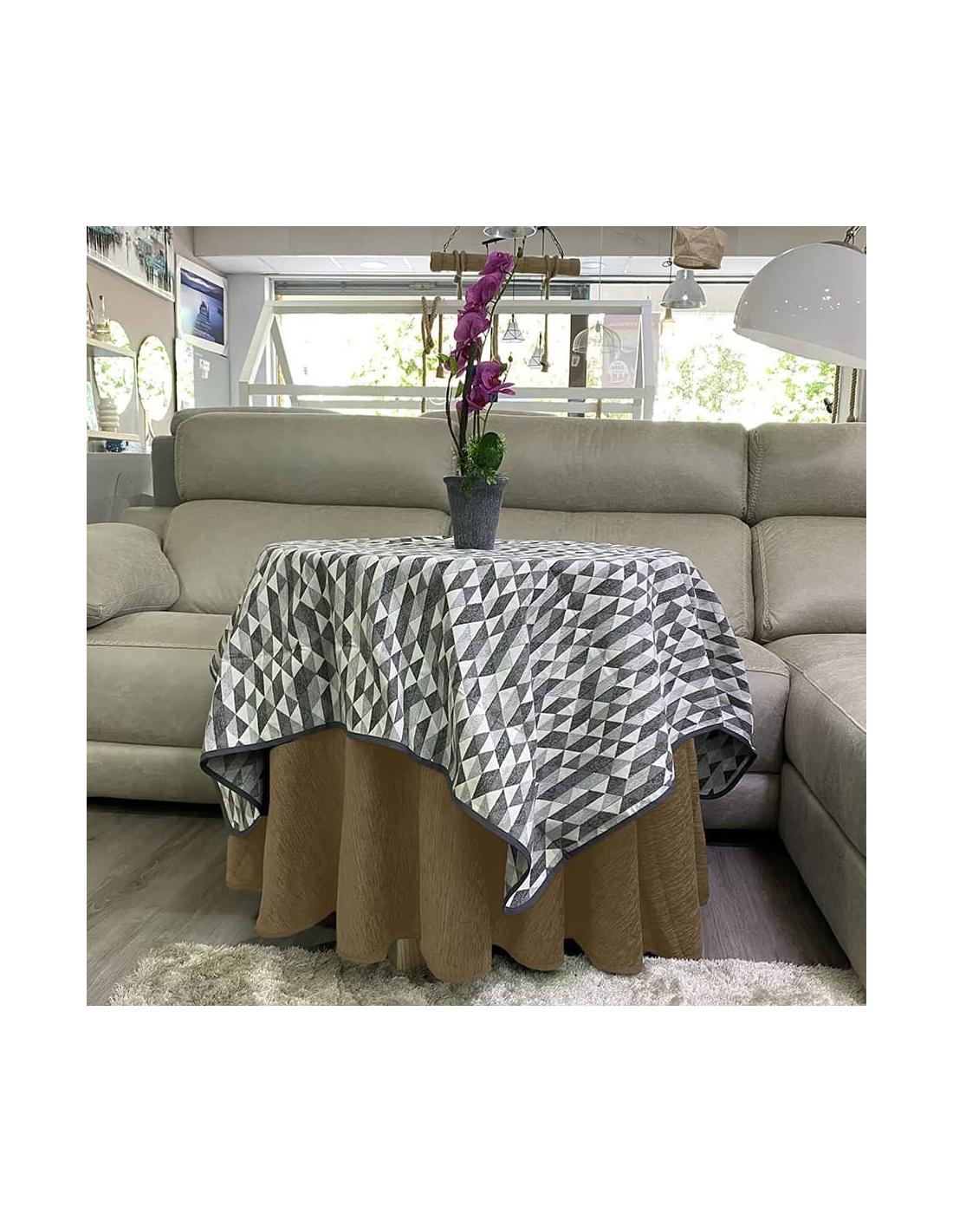 Disfruta la calidez de esta ropa de mesa camilla redondo con tejido chenilla de gran calidad en color beige con tapete diseño picasso y costuras reforzadas para mayor durabilidad. Tacto suave y agradable, mantiene la temperatura facilitando el ahorro de consumo energético.