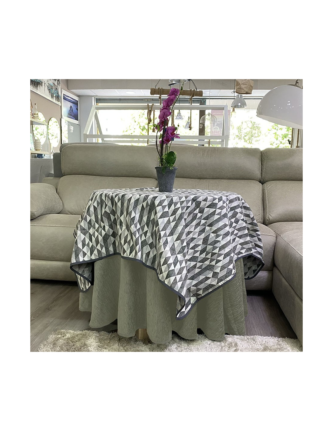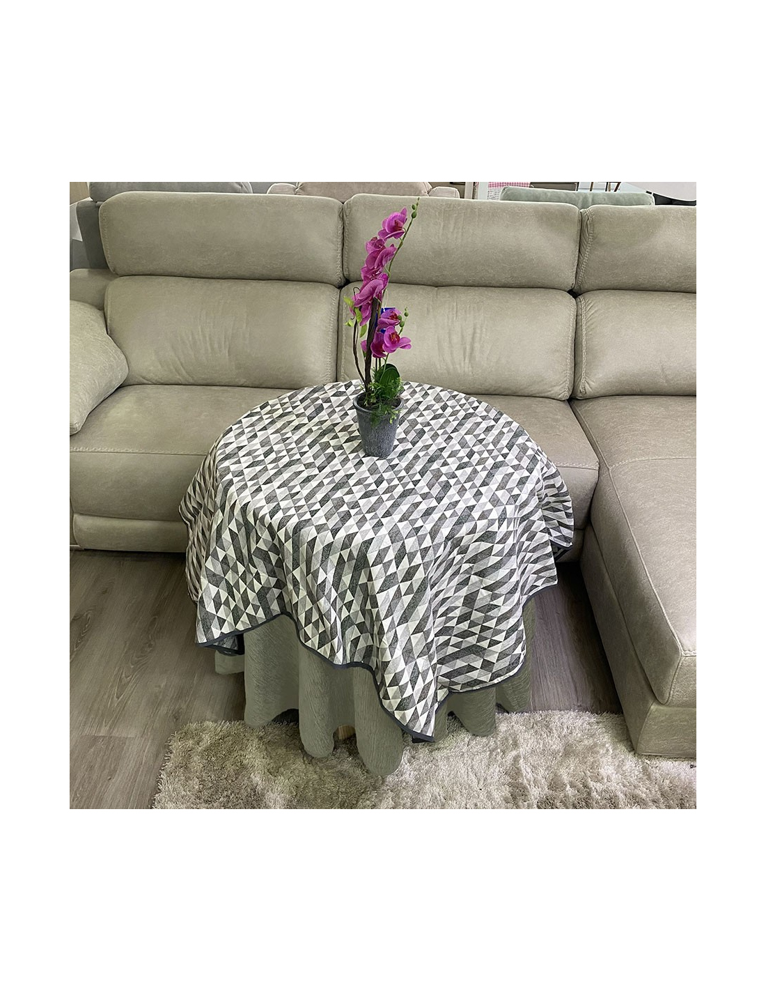 Ropa Mesa Redonda Chenilla Costura Reforzada color Gris Claro con Tapete Picasso Multimedida
